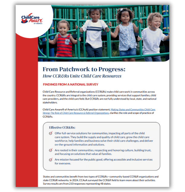 Our position statement, Making States and Communities Child Care Strong: The Role of Child Care Resource & Referral Organizations, is designed to elevate the critical role of CCR&Rs by clarifying the essential services they provide, defining what effective CCR&Rs look like, and offering actionable strategies for policymakers, administrators, business leaders, and CCR&Rs themselves to work together to strengthen child care systems nationwide.