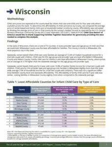This map shows child care affordability for each county in Wisconsin where available. To determine the affordability of child care prices by county, we compared the average annual price of center-based child care for infants to household median income. Click on each county to see the affordability percentage and the average annual price of center-based infant care. To view the legend, click on the arrow in the left-hand corner of the map. Download the county-level data below the map.